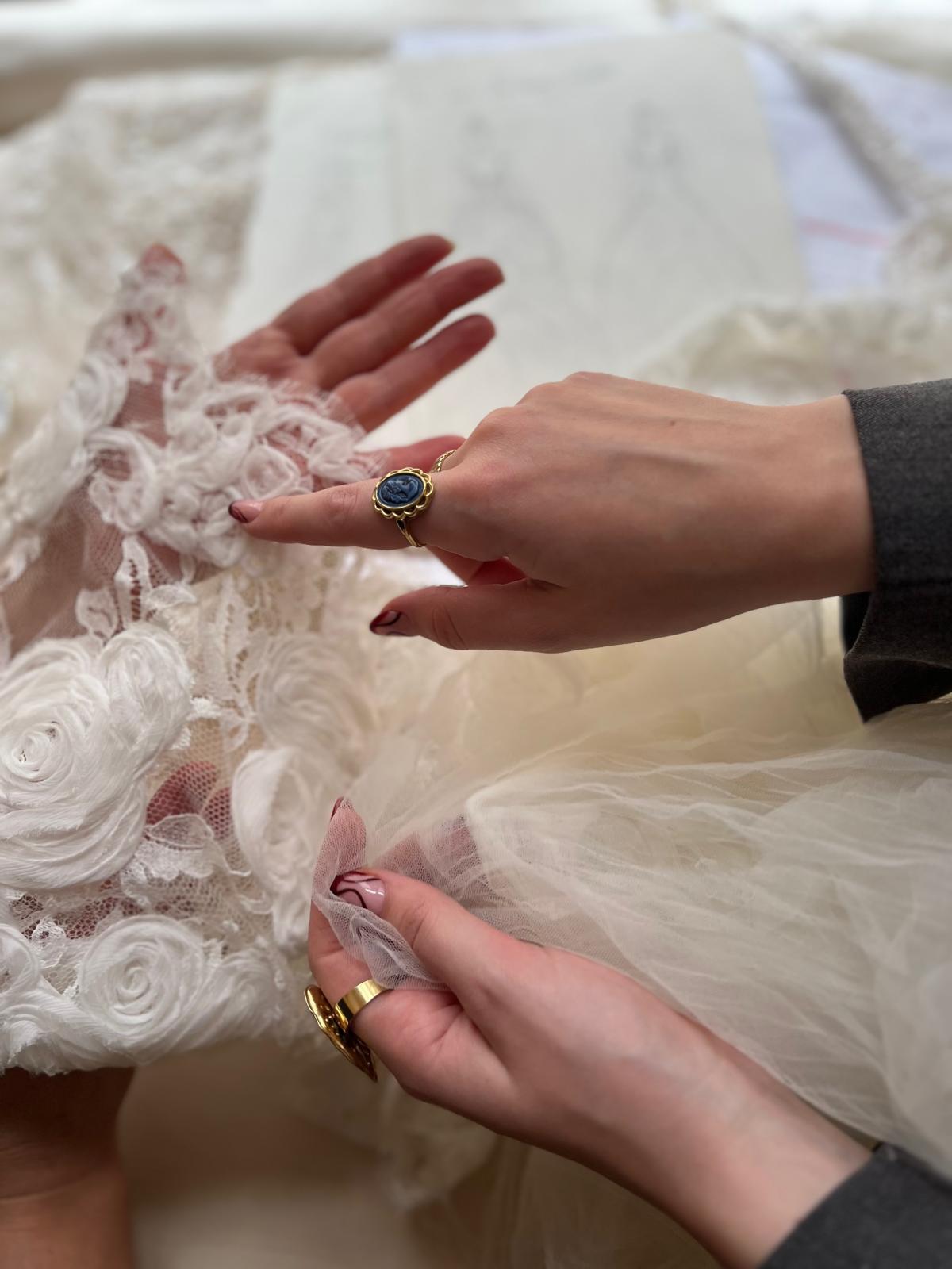 In de derde sessie is jouw trouwjurk op maat bijna klaar. Alle stoffen, lagen en details zijn nu samengebracht, waardoor je de jurk voor het eerst als volledig uitgewerkt geheel ziet. Deze fase draait om verfijning en perfectie — kleine nuances en afwerkingen die wij zorgvuldig finetunen, omdat couture draait om het detail.