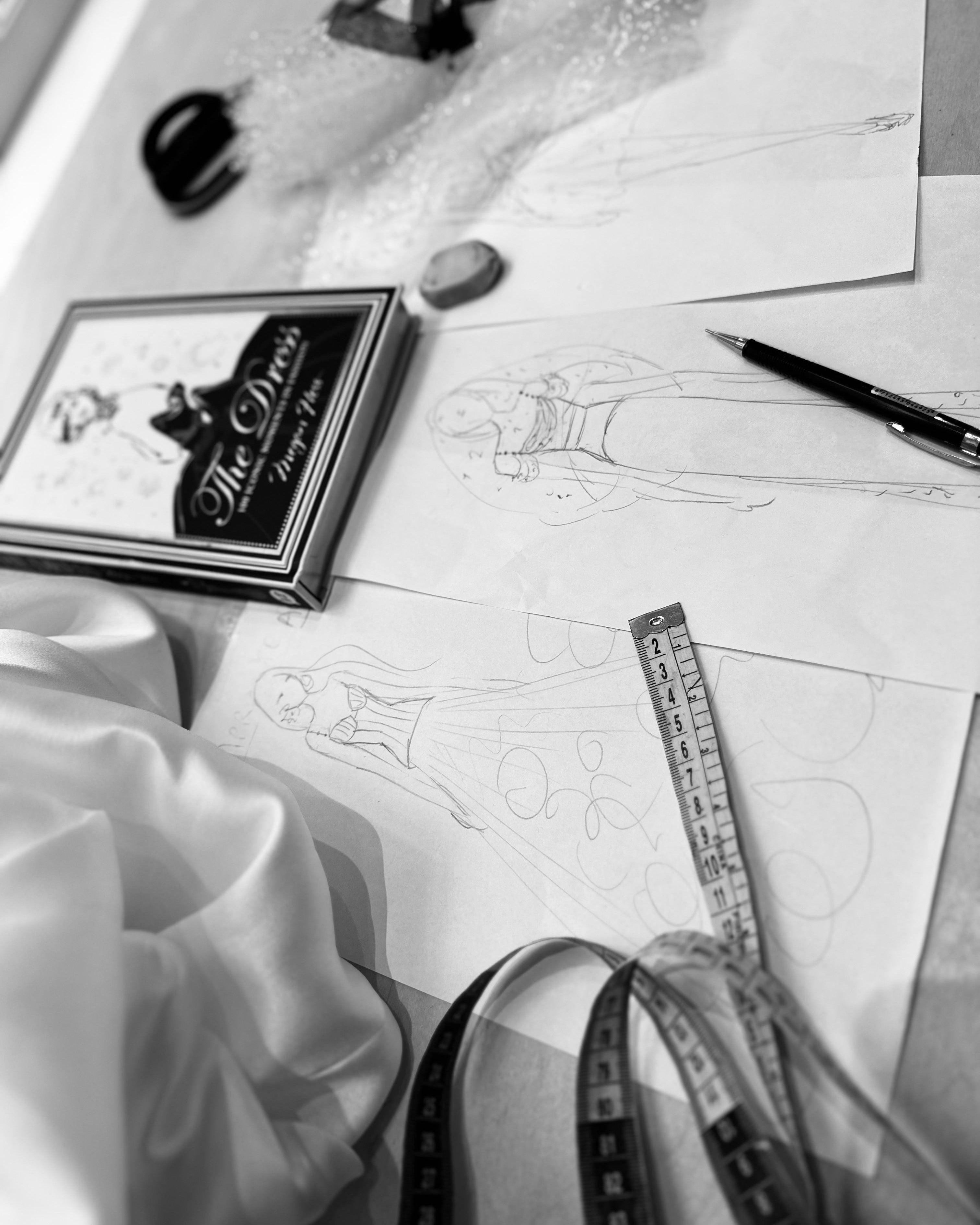 Voor deze sessie is het belangrijk dat je jouw schoenen — of in ieder geval de juiste hakhoogte — meeneemt. In deze fase spelden wij de lengte van jouw jurk nauwkeurig af, zodat pasvorm en proportie perfect aansluiten op jouw silhouet. Sommige details laten we nog bewust open, zodat we creatieve keuzes verder kunnen uitwerken terwijl jouw jurk steeds “echter” wordt.